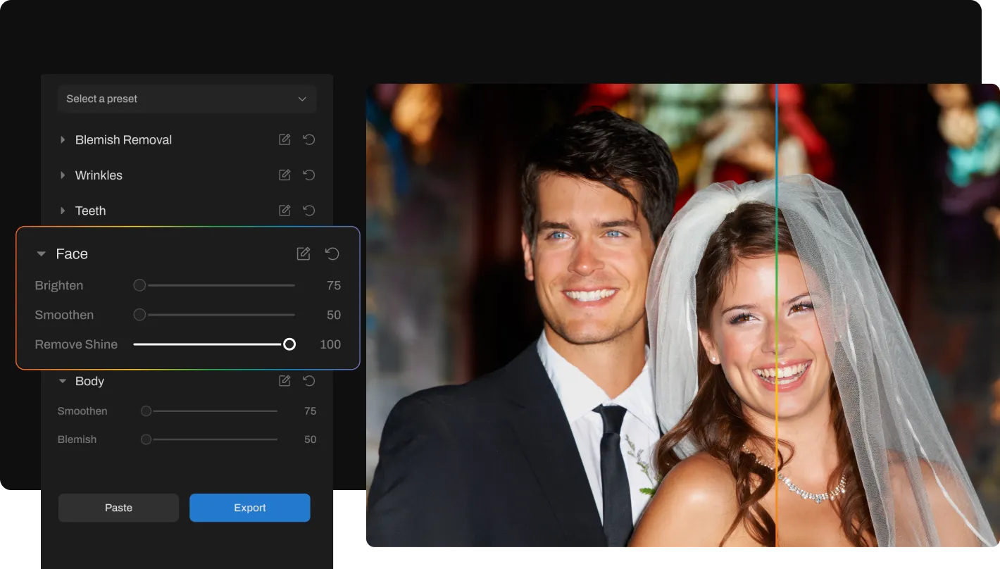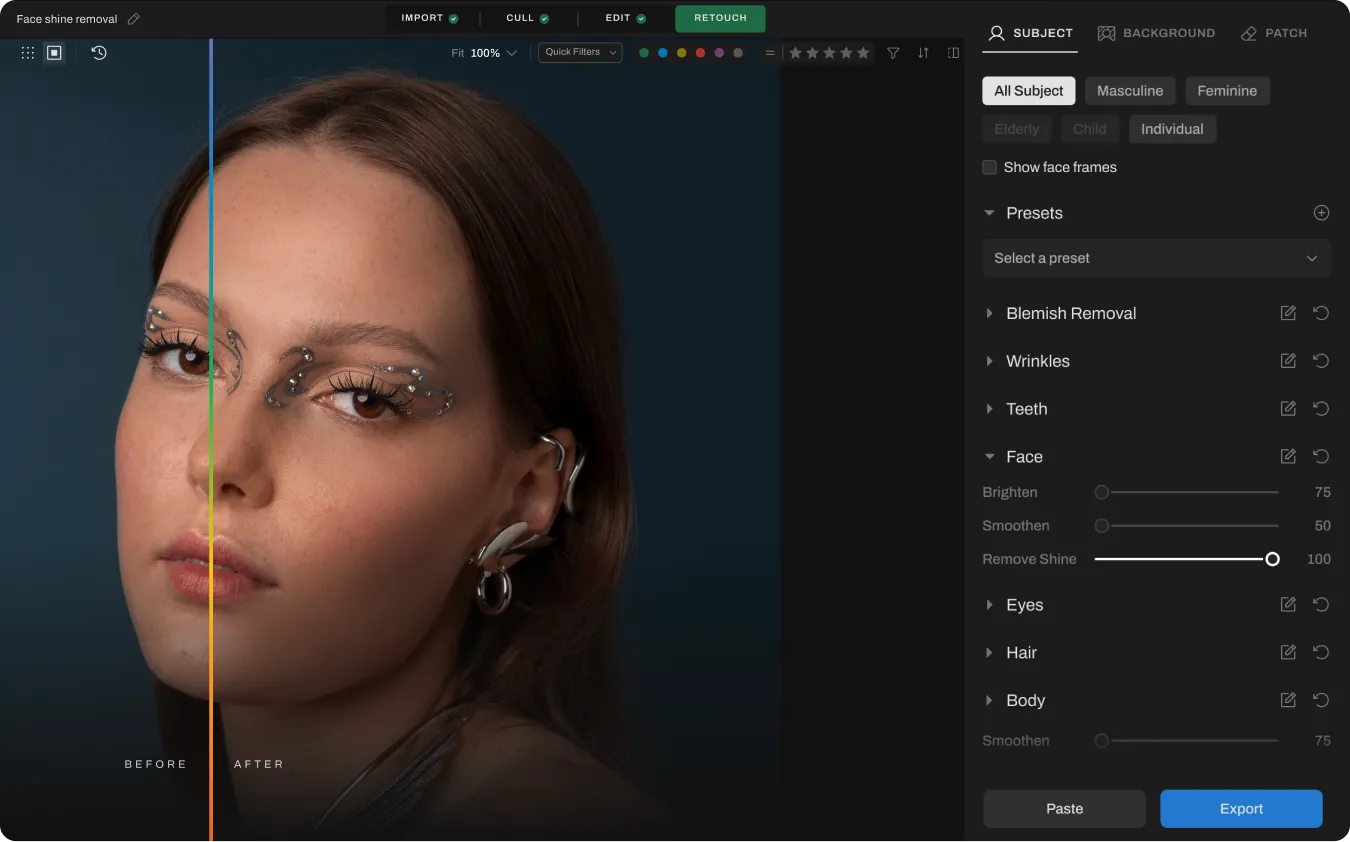 Yes. Aftershoot’s AI can automatically detect and reduce facial shine during retouching, saving time compared to manual exposure or brush-based edits.