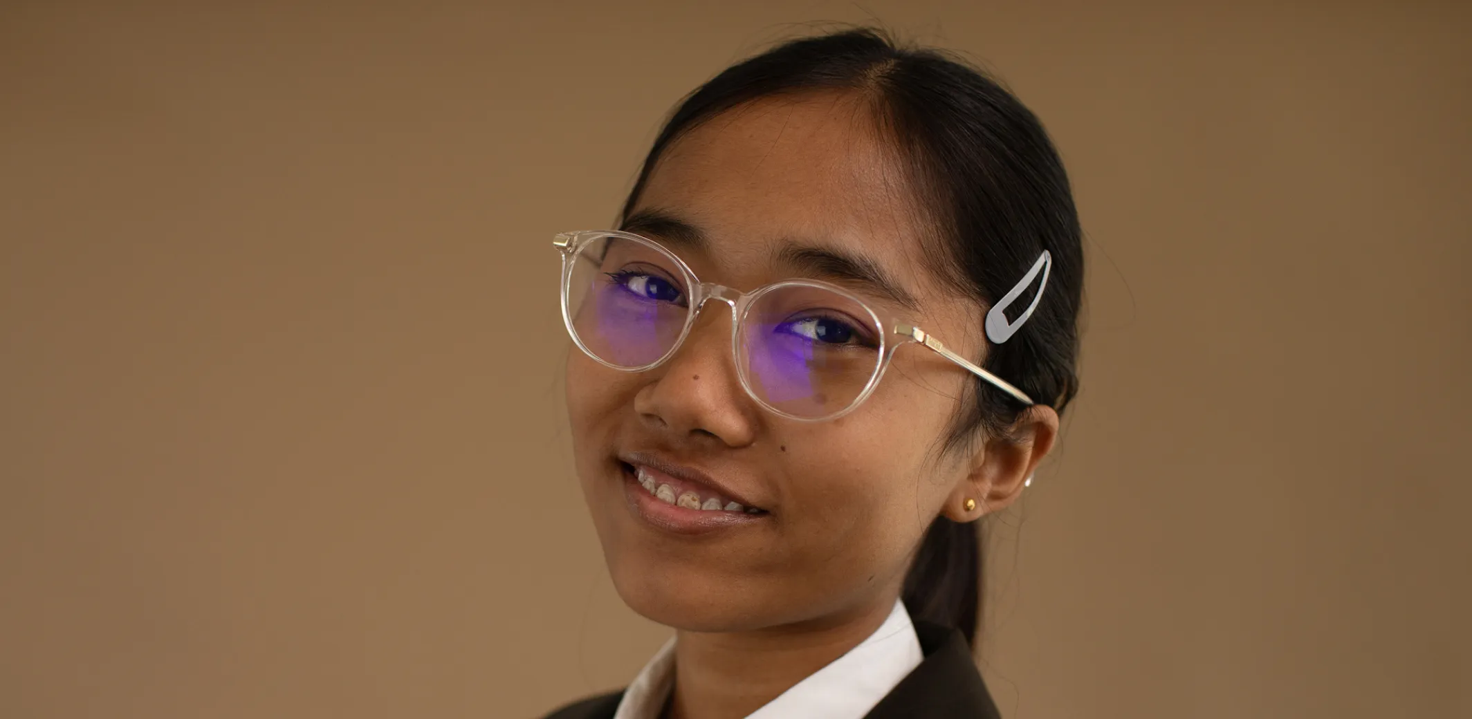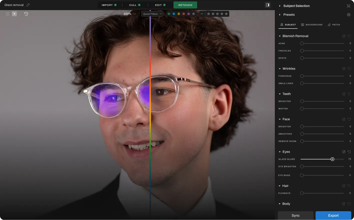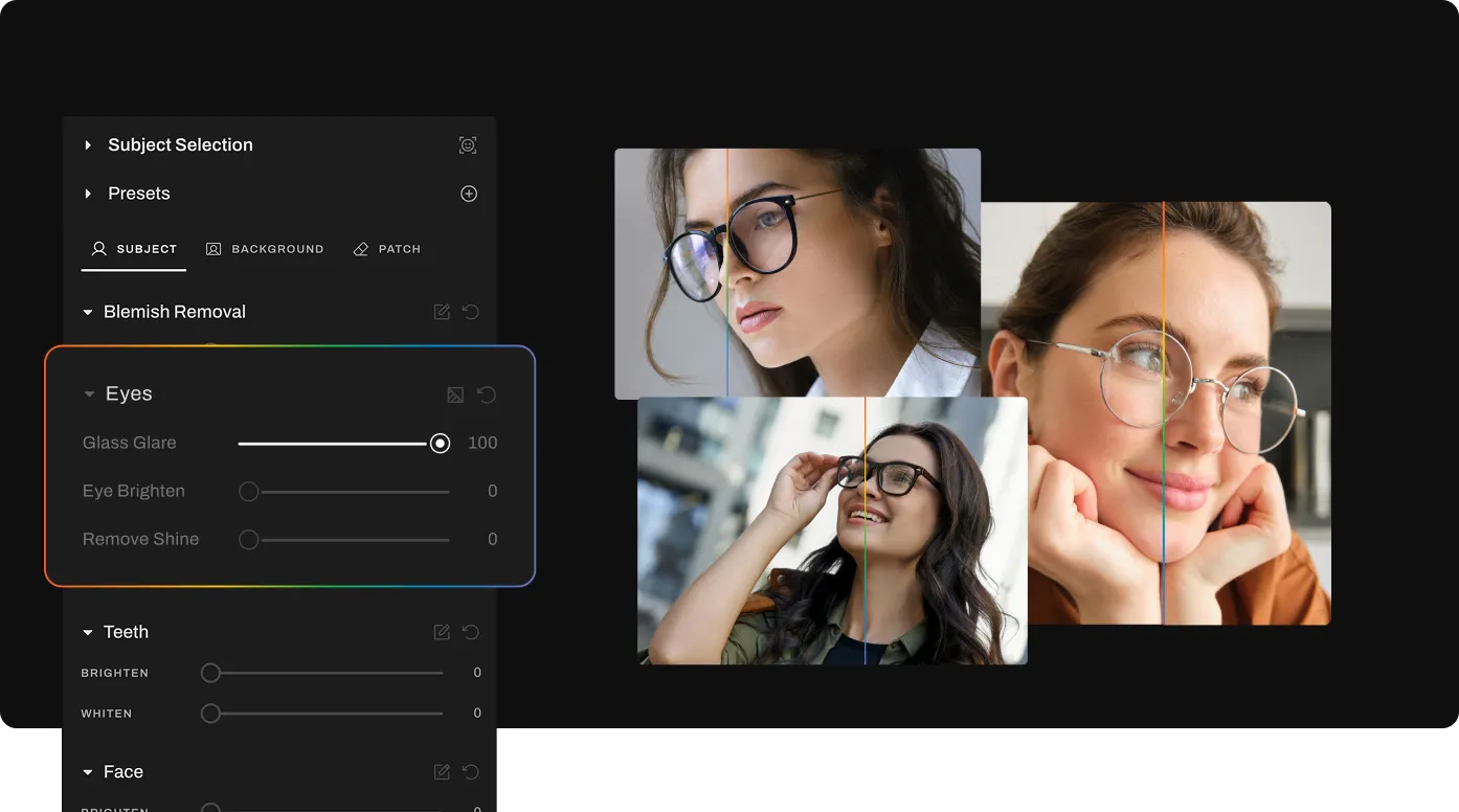 Aftershoot automatically detects glare from glasses and restores eye detail. Choose a Retouching preset, upload your photos, and the AI removes glare while keeping natural texture. You can review and adjust intensity for fine control.