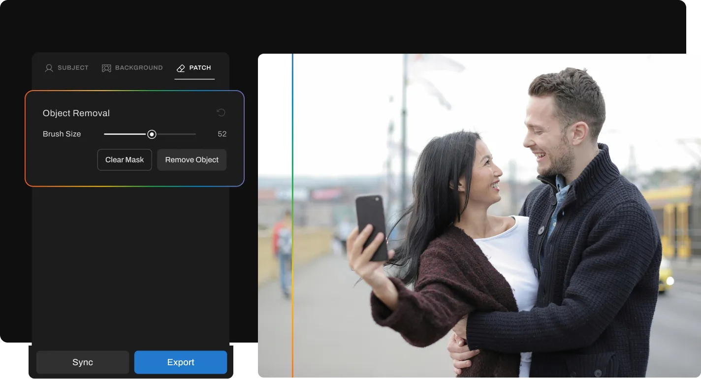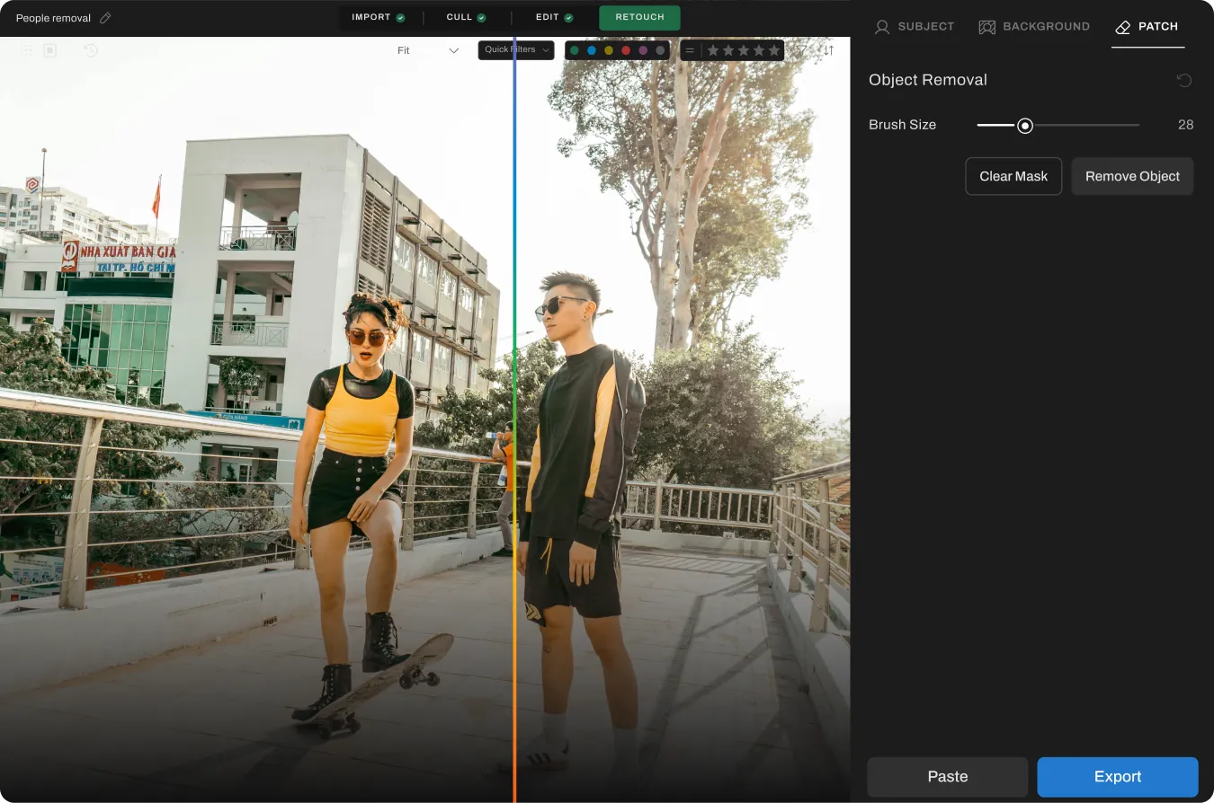 Go to Retouching, select Object Removal under “Patch” tab, and adjust the slider to remove distracting objects from the photo