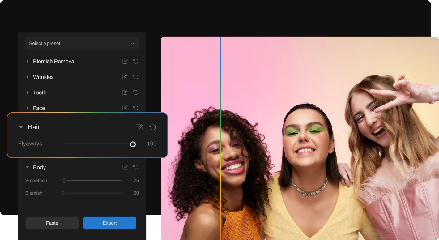 Yes. You can apply your preferences for AI Stray Hair Remover across multiple photos using Aftershoot’s retouching presets. This makes it easy to clean up flyaways consistently across portrait sessions, weddings, or large galleries, while still reviewing results before export.
