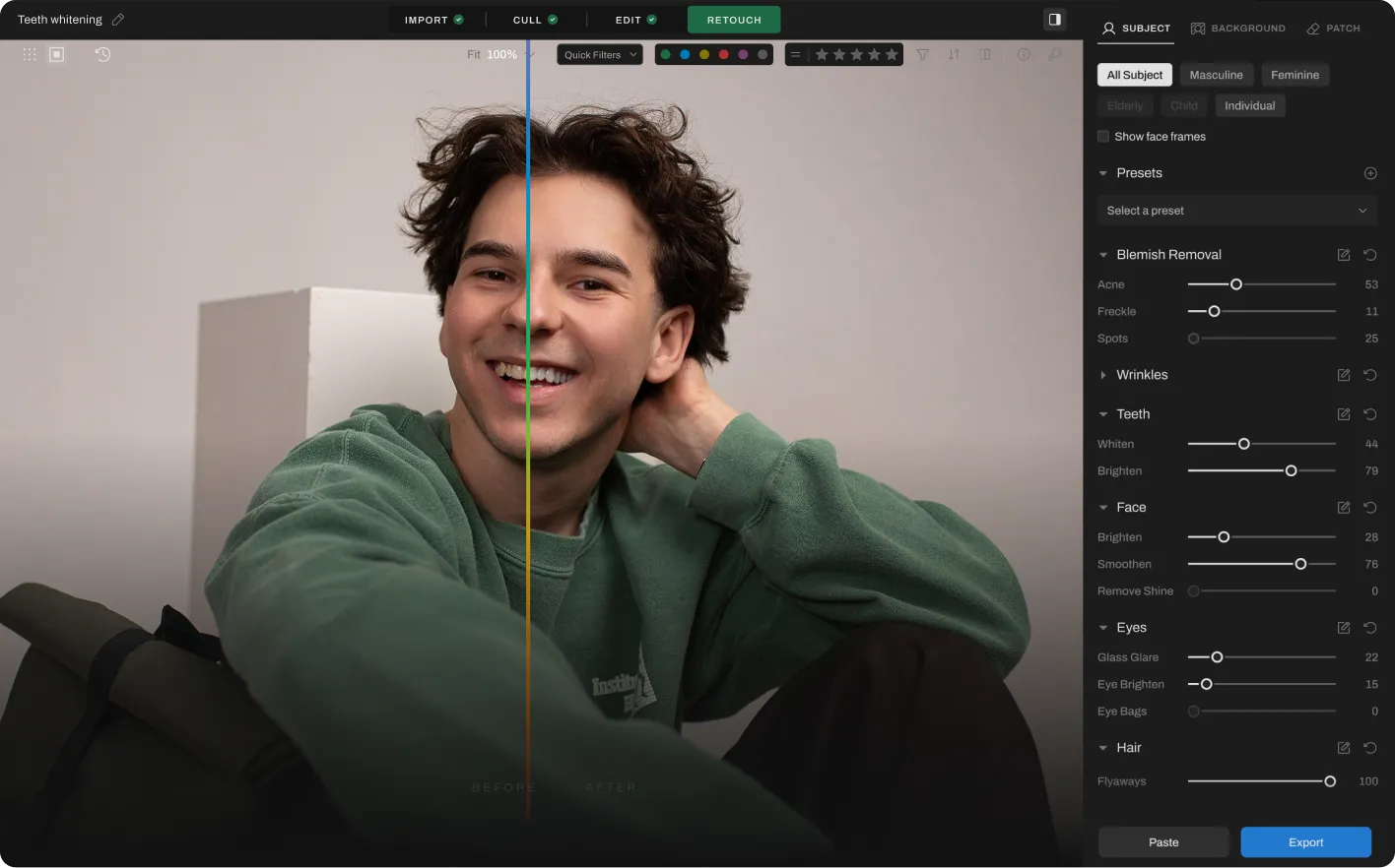 Aftershoot maintains natural tooth color while removing yellowness or uneven tones. Adjust intensity from a subtle refresh to a polished, camera-ready finish, putting you fully in control of every smile.