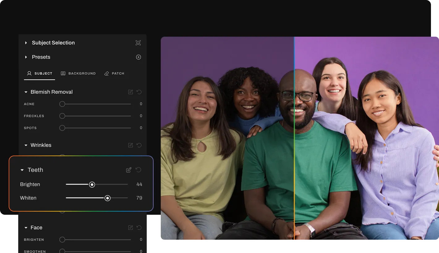 Whiten teeth in pictures without overdoing it. Enhance every smile naturally in minutes with AI.
