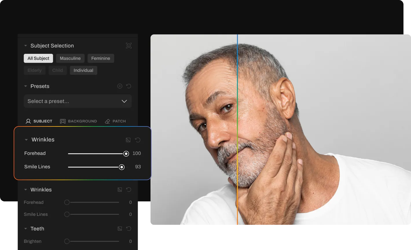 Go to Retouching, select Wrinkles, and adjust the slider for subtle or polished results