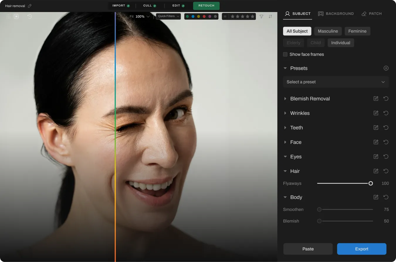 Yes. You can adjust the intensity of wrinkle reduction through Aftershoot’s retouching presets. This allows you to choose subtle corrections or slightly stronger softening based on the subject and style of the shoot.
