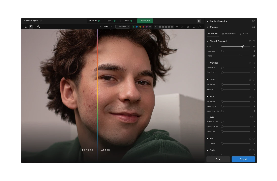 Acne happens, clear it up instantly for fresh, polished portraits without over-editing.