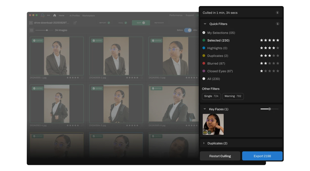 Aftershoot’s user-friendly platform and AI tools streamline the entire post-production workflow in one place. We help studios working with schools by automating time-consuming tasks such as culling, cropping, straightening, adjusting hair, skin, teeth, and a lot more. Our features ensure all photos are consistently polished, allowing you to focus more on capturing the right moment and less on post-production.
